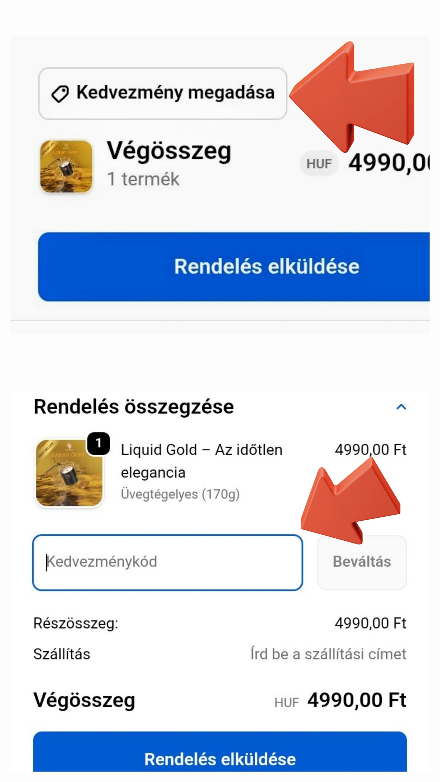 Ha rendelkezel kuponkóddal, akkor a kupont a rendelés véglegesítésekor, a pénztár oldal legalján (következő oldal)található „Kedvezménykód” mezőbe kell beírni. Ha ez nem jelenik meg automatikusan, akkor a "kedvezmény megadása" mezőre kell először kattintani, amely szintén a pénztár oldal legalján található!